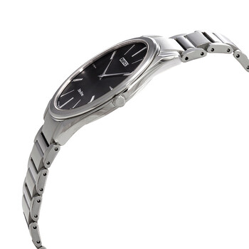 Stainless steel case with a stainless steel bracelet. Fixed stainless steel bezel. Black dial with silver-tone hands and index hour markers. Dial Type: Analog. Citizen caliber G870 eco-drive movement. Scratch resistant sapphire crystal. Pull / push crown. Solid case back. Round case shape. Case size: 39 mm. Case thickness: 10 mm. Band width: 20 mm. Fold over clasp with a push button release. Water resistant at 30 meters / 100 feet. Functions: hour, minute. Stiletto Series. Casual watch style. Watch label: Japan Movt. Citizen Stiletto Black Dial Men's Watch AR3071-87E.