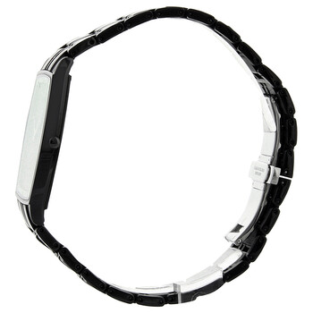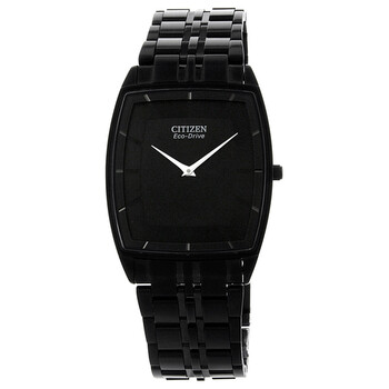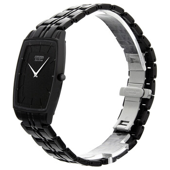Black IP stainless steel case with a black IP stainless steel bracelet. Fixed bezel. Black dial with silver-tone hands and stick hour markers. Dial Type: Analog. Quartz movement. Scratch resistant sapphire crystal. Solid case back. Case diameter: 31 x 33.5 mm. Tonneau case shape. Band width: 20 mm. Deployment clasp with push button. Water resistant at 30 meters / 100 feet. Functions: hour, minute. Casual watch style. Citizen Stiletto Eco-Drive Black Dial Black IP Stainless Steel Men's Watch AR3025-50E.