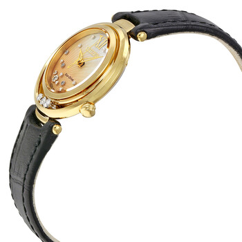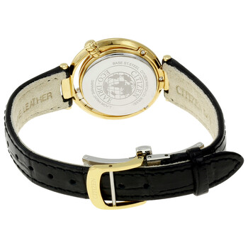 Gold-tone stainless steel case with a black leather strap. Fixed gold-tone bezel. Mother of pearl dial with gold-tone hands and diamond hour markers. A Roman numeral at the 12 o'clock position. Dial Type: Analog. Eco-drive movement. Scratch resistant sapphire crystal. Pull / push crown. Solid case back. Case size: 30 mm. Case thickness: 7 mm. Round case shape. Band width: 14 mm. Deployment with push button release clasp. Water resistant at 50 meters / 165 feet. Functions: hour, minute, second. Casual watch style. Watch label: Japan Movt. Item Variations: EM0322 02Y, EM0322.02Y, EM032202Y. Citizen Sunrise Eco-Drive Diamond Black Leather Strap Ladies Watch CZEM0322-02Y.