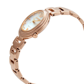 Rose gold-tone stainless steel case and bracelet. Fixed rose gold-tone bezel. Rose gold-tone skeleton hands and index hour markers. A Roman numeral appears at the 12 o'clock position. Dial Type: Analog. Citizen Caliber Eco-Drive E031 eco-drive movement. Scratch resistant sapphire crystal. Pull / push crown. Solid case back. Round case shape, case size: 30.2 mm, case thickness: 7.2 mm. Fold over clasp with a safety release. Water resistant at 50 meters / 165 feet. Functions: hour, minute, second, solar-powered. Sunrise Series. Dress watch style. Watch label: Japan Movt. Citizen Sunrise Ladies Rose Gold-tone Watch EM0333-57A.