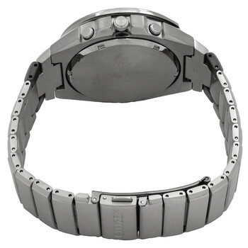 Super titanium case with a silver-tone and grey titanium and DLC-plated link bracelet. Uni-directional rotating super titanium bezel. Black dial with silver-tone hands and index hour markers. Minute markers around the outer rim. Dial Type: Analog. Date display at the 3 o'clock position. Chronograph - two sub-dials displaying: 60 second and 60 minute. Citizen Caliber B642 eco-drive movement. Scratch resistant sapphire crystal. Solid case back. Round case shape, case size: 44 mm. Band width: 21 mm. Fold over clasp with a safety release. Water resistant at 100 meters / 330 feet. Functions: chronograph, date, hour, minute, small second, solar-powered. Super Titanium Armor Series. Sport watch style. Watch label: Japan Movt. Citizen Super Titanium Armor Chronograph Black Dial Men's Watch CA7058-55E.