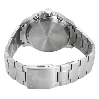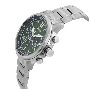 Silver-tone titanium case and bracelet. Fixed silver-tone titanium bezel. Green dial with silver-tone hands and index hour markers. Minute markers around the outer rim. Dial Type: Analog. Luminescent hands and markers. Date display between 4 and 5 o'clock position. Chronograph - three sub-dials displaying: 60 second, 60 minute and 24 hour. Eco-drive movement. Scratch resistant mineral crystal. Solid case back. Round case shape, case size: 44 mm, case thickness: 12 mm. Fold over clasp with a safety release. Water resistant at 100 meters / 330 feet. Functions: chronograph, date, hour, minute, second. Super Titanium Series. Sport watch style. Watch label: Japan Movt. Citizen Super Titanium Chronograph Eco-Drive Green Dial Men's Watch CA4570-88X.