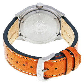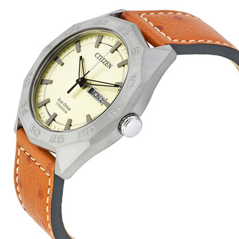 Titanium case with a tan ostrich leather strap. Fixed titanium bezel. Light champagne dial with black hands and index hour markers. Minute markers around the outer rim. Dial Type: Analog. Day of the week and date display at the 3 o'clock position. Citizen caliber Eco-Drive J800 quartz movement. Scratch resistant mineral crystal. Pull / push crown. Solid case back. Case size: 44 mm. Case thickness: 10 mm. Round case shape. Band width: 22 mm. Tang clasp. Water resistant at 100 meters / 330 feet. Functions: date, day, hour, minute, second. Additional Info: ): in general, suitable for swimming and snorkeling, but not diving. Sport watch style. Citizen Super Titanium Men's Watch AW0060-11P.