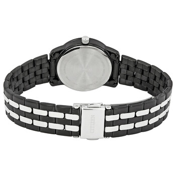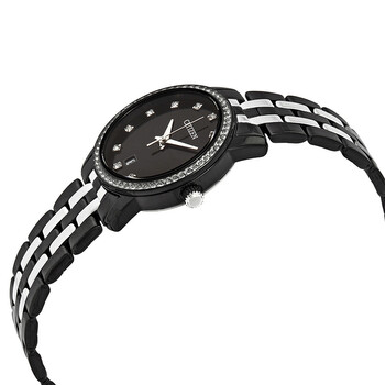 Black ion-plated stainless steel case with a two-tone (black ion-plated and silver-tone) stainless steel bracelet. Fixed black ion-plated bezel set with Swarovski crystals. Black dial with silver-tone hands and crystal hour markers. Dial Type: Analog. Date display at the 6 o'clock position. Quartz movement. Scratch resistant mineral crystal. Pull / push crown. Solid case back. Round case shape. Case size: 27 mm. Case thickness: 7 mm. Fold over clasp. Water resistant at 50 meters / 165 feet. Functions: date, hour, minute, second. Additional Info: in general, suitable for short periods of recreational swimming, but not diving or snorkeling. Dress watch style. Watch label: Japan Movt. Citizen Swarovski Crystal Black Dial Ladies Watch EU6037-57E.