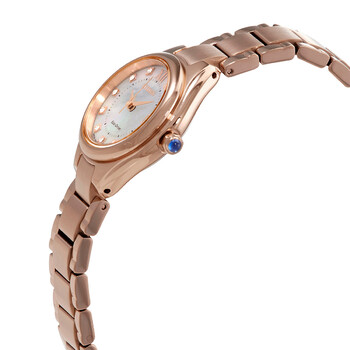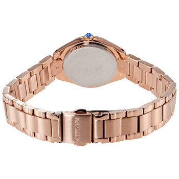 Rose gold-tone stainless steel case and bracelet. Fixed rose gold-tone bezel. White mother of pearl dial with rose gold-tone hands and Swarovski crystal hour markers. A Roman numeral appears at the 12 o'clock position. Minute markers around an inner ring. Dial Type: Analog. Date display at the 3 o'clock position. Calibre E011 eco-drive movement. Scratch resistant sapphire crystal. Pull / push crown. Solid case back. Round case shape. Case size: 26 mm. Case thickness: 7.45 mm. Band width: 12 mm. Fold over clasp with a push button release. Water resistant at 50 meters / 165 feet. Functions: date, hour, minute, second. Eco-drive Series. Dress watch style. Watch label: Japan Movt. Citizen Swarovski Crystal White Mother of Pearl Dial Ladies Watch EW2543-85D.