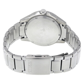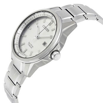 Titanium case with a titanium bracelet. Fixed titanium bezel. Silver dial with silver-tone hands and index hour markers. Minute markers around the outer rim. Dial Type: Analog. Luminescent hands and markers. Date display at the 3 o'clock position. Citizen caliber Eco-Drive J810 quartz movement. Scratch resistant sapphire crystal. Push / pull crown. Solid case back. Case size: 42 mm. Case thickness: 11 mm. Round case shape. Band width: 20 mm. Fold over clasp with a safety release. Water resistant at 100 meters / 330 feet. Functions: date, hour, minute, second. Sport watch style. Citizen TI + IP Eco-Drive Men's Watch AW1490-50A.