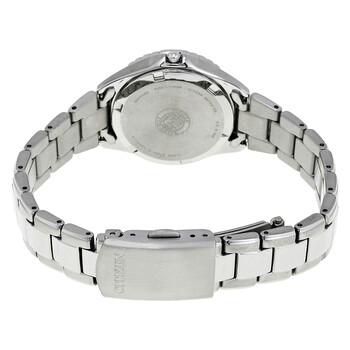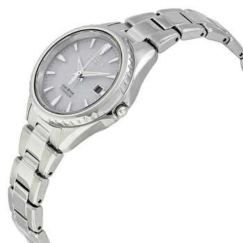 Grey titanium case with a grey titanium bracelet. Fixed grey titanium bezel. Baby blue dial with luminous silver-tone hands and index hour markers. Minute markers around the outer rim. Dial Type: Analog. Luminescent hands. Date display at the 3 o'clock position. Citizen caliber Eco-Drive E011 eco-drive movement. Scratch resistant sapphire crystal. Pull / push crown. Solid case back. Case size: 28 mm. Case thickness: 9 mm. Round case shape. Band width: 15 mm. Fold over clasp with a safety release. Water resistant at 100 meters / 330 feet. Functions: date, hour, minute, second. Additional Info: in general, suitable for swimming and snorkeling, but not diving. Dress watch style. Watch label: Japan Movt. Citizen Titanium Baby Blue Dial Ladies Watch EW2410-54L.