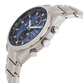 Silver-tone titanium case and bracelet. Fixed silver-tone titanium bezel. Blue dial with silver-tone hands and index hour markers. Minute markers around the outer rim. Dial Type: Analog. Luminescent hands and markers. Date display at the 4 o'clock position. Citizen Caliber H874 eco-drive movement. Scratch resistant sapphire crystal. Solid case back. Round case shape, case size: 43 mm, case thickness: 10.9 mm. Band width: 22 mm. Fold over clasp with a safety release. Water resistant at 100 meters / 330 feet. Functions: date, hour, minute, second, moonphase, world time in 24 time zones, radio control, perpetual calendar. Tsuki-yomi A-t Series. Sport watch style. Watch label: Japan Movt. Citizen Tsuki-yomi A-T Eco-Drive Perpetual World Time Blue Dial Men's Watch BY1010-81L.