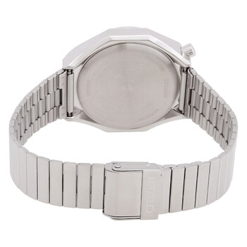 Silver-tone stainless steel case and bracelet. Fixed silver-tone stainless steel bezel. Black dial with silver-tone hands and index hour markers. Minute markers around the outer rim. Dial Type: Analog. Luminescent hands and markers. Date display between 4 and 5 o'clock position. Chronograph - three sub-dials displaying: 60 second, 60 minute and 12 hour. Citizen Caliber 0510 quartz movement. Scratch resistant mineral crystal. Solid case back. Case size: 38 mm. Band width: 18 mm. Sliding clasp. Water resistant at 50 meters / 165 feet. Functions: chronograph, date, hour, minute, second. Tsuno Series. Sport watch style. Citizen Tsuno Chronograph Quartz Black Dial Men's Watch AN3700-54E.