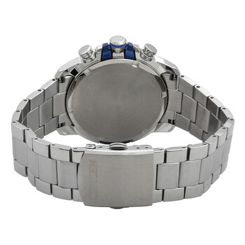 Silver-tone stainless steel case and bracelet. Fixed silver-tone stainless steel bezel. Black dial with blued hands and index hour markers. Minute scale around the inner rim. Dial Type: Analog. Luminescent hands and markers. Date display at the 3 o'clock position. Chronograph - three sub-dials displaying: 60 second, 60 minute and 1/10th of a second. Solid case back. Round case shape, case size: 45 mm. Fold over clasp with a safety release. Water resistant at 100 meters / 330 feet. Functions: date, hour, minute, second. Weekender Series. Sport watch style. Watch label: Japan Movt. Citizen Weekender Black Dial Men's Watch CA0426-51E.