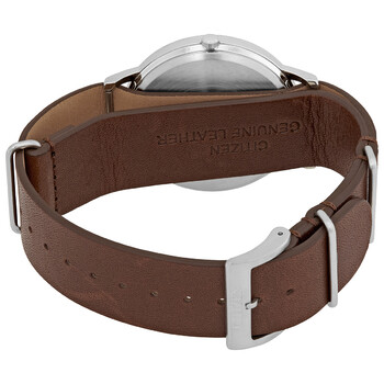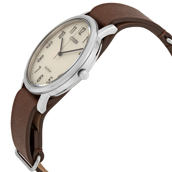 Stainless steel case with a brown leather strap. Fixed stainless steel bezel. Off white dial with black hands and Arabic numeral hour markers. Minute markers around the outer rim. Dial Type: Analog. Eco-drive (solar-powered) movement. Scratch resistant mineral crystal. Pull / push crown. Solid case back. Round case shape. Case size: 41 mm. Case thickness: 8 mm. Band width: 20 mm. Tang clasp. Water resistant at 50 meters / 165 feet. Functions: hour, minute, second. Casual watch style. Citizen White Dial Brown Leather Men's Watch BJ6501-28A