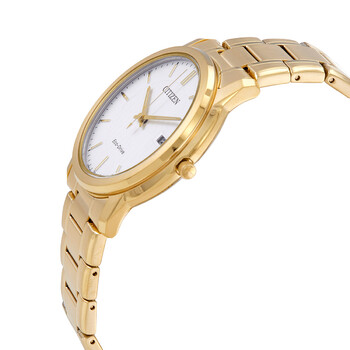 Gold-tone stainless steel case and bracelet. Fixed gold-tone bezel. White dial with gold-tone hands and index hour markers. Minute markers around the outer rim. Dial Type: Analog. Date display at the 3 o'clock position. Citizen caliber J180 eco-drive movement. Scratch resistant mineral crystal. Pull / push crown. Solid case back. Round case shape. Case size: 41 mm. Case thickness: 9.4 mm. Band width: 21 mm. Fold over clasp with a push button release. Water resistant at 50 meters / 165 feet. Functions: date, hour, minute, second. Casual watch style. Watch label: Japan Movt. Citizen White Dial Gold-tone Men's Watch AW1212-87A.