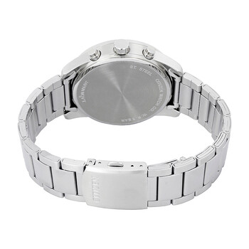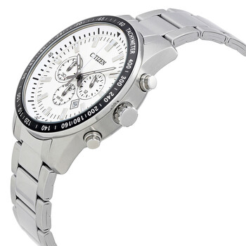 Stainless steel case with a stainless steel bracelet. White dial with silver-tone hands and index hour markers. Tachymeter. Dial Type: Analog. Luminescent hands and markers. Date display between 4 and 5 o'clock position. Chronograph - three sub-dials displaying: 60 second, 60 minute and 24 hours. Quartz movement. Scratch resistant mineral crystal. Case size: 44 mm. Round case shape. Water resistant at 50 meters / 165 feet. Functions: chronograph, date, hour, minute, second. Dress watch style. Citizen White Dial Men's Chronograph Watch AN8071-51A.