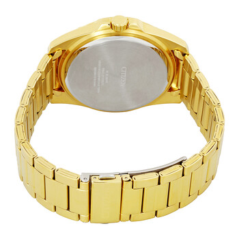 Gold tone stainless steel case with a gold tone stainless steel bracelet. Fixed bezel. White dial with gold-tone hands and index-Arabic at the 12 o' clock hour markers. Dial Type: Analog. Luminescent hands and markers. Date display at the 3 o'clock position. Three- date, day of the week, 24 hours. Quartz movement. Scratch resistant mineral crystal. Pull / push crown. Solid case back. Case size: 44 mm. Round case shape. Water resistant at 50 meters / 165 feet. Functions: date, day, hour, minute, second, 12/24 hours, am- pm indicator. Casual watch style. Citizen White Dial Men's Gold Tone Watch AG8332-56A.