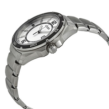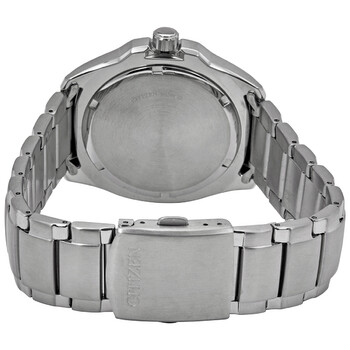 Stainless steel case with a stainless steel bracelet. Fixed stainless steel bezel with a black ion-plated ring. White dial with luminous silver-tone hands and index hour markers. Arabic numerals mark the 6 and 12 o'clock positions. Minute markers around an inner ring. Dial Type: Analog. Luminescent hands. Date display at the 3 o'clock position. Quartz movement. Scratch resistant mineral crystal. Pull / push crown. Solid case back. Round case shape. Case size: 42 mm. Case thickness: 11 mm. Band width: 22 mm. Fold over clasp with a safety release. Water resistant at 100 meters / 330 feet. Functions: date, hour, minute, second. Casual watch style. Watch label: Japan Movt. Citizen White Dial Quartz Men's Watch BK2520-53A.