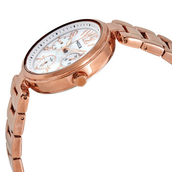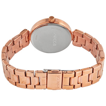 Rose gold-tone stainless steel case and bracelet. Fixed rose gold-tone bezel. Mother of pearl dial with luminous rose gold-tone hands and Arabic numeral hour markers. Minute markers around the outer rim. Dial Type: Analog. Luminescent hands. Date display at the 3 o'clock position. Three sub-dials displaying: dual seconds / day-night indicator, days of the week and date. Citizen Caliber 6329 quartz movement. Mineral crystal. Pull / push crown. Solid case back. Round case shape. Case size: 33 mm. Bracelet width: 14 mm. Deployment clasp. Water resistant at 30 meters / 100 feet. Functions: date, day, GMT, second time zone, hour, minute, second. Casual watch style. Watch label: Japan Movt. Citizen Wicca Quartz Mother Of Pearl Dial Ladies Watch BH7-423-11.