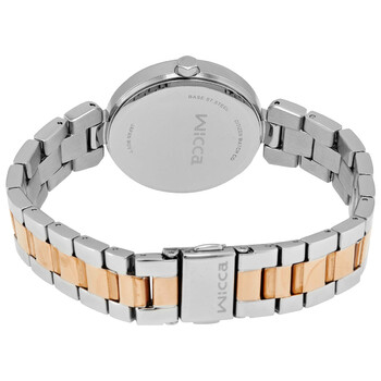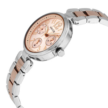 Stainless steel case with a two-tone (silver-tone and rose gold-tone) stainless steel bracelet. Fixed stainless steel bezel. Rose dial with luminous rose gold-tone hands and Arabic numeral hour markers. Minute markers around the outer rim. Dial Type: Analog. Date display at the 3 o'clock position. Three sub-dials displaying: seconds / day-night indicator, days of the week and date. Citizen caliber 6329 quartz movement. Scratch resistant mineral crystal. Pull / push crown. Solid case back. Round case shape. Case size: 33 mm. Band width: 14 mm. Deployment clasp. Water resistant at 30 meters / 100 feet. Functions: date, day, GMT, second time zone, hour, minute, second. Dress watch style. Watch label: Japan Movt. Citizen Wicca Quartz Rose Dial Ladies Watch BH7-431-91.
