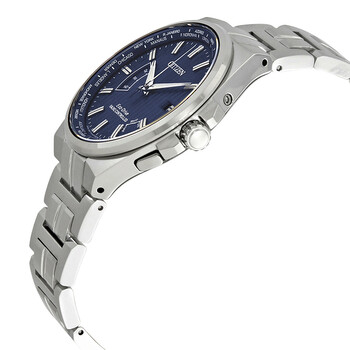 Stainless steel case with a stainless steel bracelet. Fixed stainless steel bezel. Blue dial with luminous silver-tone hands and index hour markers. Minute markers. World time cities around the outer rim. Dial Type: Analog. Luminescent hands. Perpetual calendar. Signal reception indicator. Summer time indicator. Citizen caliber Eco-Drive H145 eco-drive movement. Scratch resistant sapphire crystal. Solid case back. Round case shape. Case size: 42 mm. Case thickness: 10 mm. Band width: 25 mm. Fold over clasp. Water resistant at 100 meters / 330 feet. Functions: perpetual calendar, atomic timekeeping, radio controlled, world time, date, GMT, second time zone, hour, minute, second, solar-powered. Additional Info: eco-drive technology uses natural and artificial light for power, so you never need to change or purchase batteries. Sport watch style. Watch label: Japan Movt. Citizen World Perpetual A-T World Time Blue Dial Men's Watch CB0160-51L.