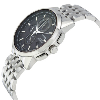 Stainless steel case with a stainless steel bracelet. Fixed stainless steel bezel. Black dial with silver-tone hands and index hour markers. Minute markers. World time cities around the outer rim. Dial Type: Analog. Luminescent hands and markers. Date display at the 4 o'clock position. Quartz movement. Scratch resistant sapphire crystal. Solid case back. Case diameter: 43 mm. Case thickness: 10 mm. Round case shape. Band width: 23 mm. Band length: 9.5 inches. Deployment clasp with a push button release. Water resistant at 100 meters / 330 feet. Functions: atomic timekeeping technology with synchronized time adjustment available in 26 time zones, displayed as cities, perpetual calendar, 1/20 second chronograph, power reserve indicator, day-date, 12/24-hour time. Additional Info: citizen eco-drive is powered by light, a watch that never needs a battery. Casual watch style. Watch label: Japan Movt. Citizen World Chronograph A-T Eco-Drive Black Dial Stainless Steel Quartz Men's Watch AT8110-53E.