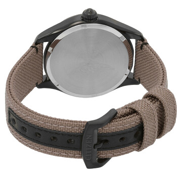 Black stainless steel case with a nylon strap. Fixed black stainless steel bezel. Brown dial with black and green hands and index hour markers. Minute markers around the outer rim. Dial Type: Analog. Luminescent hands and markers. Date display at the 3 o'clock position. Citizen Caliber Eco-Drive E111 eco-drive movement. Scratch resistant mineral crystal. Solid case back. Round case shape, case size: 42 mm. Band width: 21 mm. Tang clasp. Water resistant at 100 meters / 330 feet. Functions: date, hour, minute, second, solar-powered. Yoda Star Wars Series. Casual watch style. Watch label: Japan Movt. Citizen Yoda Star Wars Brown Dial Men's Watch BM6839-06W.