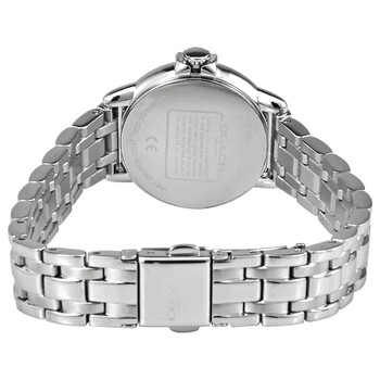Stainless steel case with a stainless steel bracelet. Fixed stainless steel bezel. White dial with silver-tone hands and Arabic numeral hour markers. Minute markers around an inner ring. Dial Type: Analog. Quartz movement. Scratch resistant mineral crystal. Pull / push crown. Solid case back. Round case shape. Case size: 28 mm. Case thickness: 9 mm. Band width: 17 mm. Fold over clasp with a push button release. Water resistant at 50 meters / 165 feet. Functions: hour, minute, second. Additional Info: features a dimensional coach signature crown. Arden Series. Casual watch style. Coach Arden Quartz White Dial Ladies Watch 14503601.