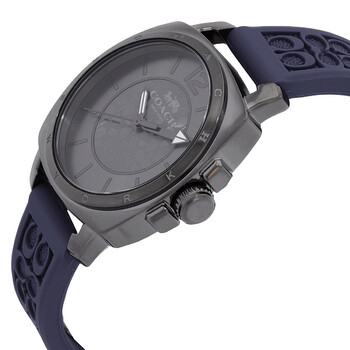 Grey ion-plated stainless steel case with a blue silicone strap. Fixed grey ion-plated stainless steel bezel. Grey dial with grey hands and index-Arabic numeral hour markers. Arabic numeral marker appears at the 12 o'clock position. Dial Type: Analog. Quartz movement. Scratch resistant mineral crystal crystal. Pull / push crown. Solid case back. Round case shape, case size: 34 mm. Buckle clasp. Water resistant at 30 meters / 100 feet. Functions: hour, minute, second. Boyfriend Series. Casual watch style. Coach Boyfriend Quartz Grey Dial Ladies Watch 14503978.