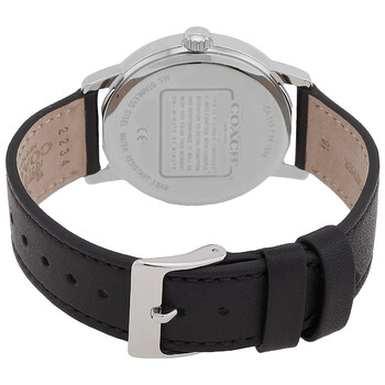 Silver-tone stainless steel case with a black leather strap. Fixed silver-tone stainless steel bezel. Black dial with silver-tone hands and index hour markers. Dial Type: Analog. Quartz movement. Scratch resistant mineral crystal. Pull / push crown. Solid case back. Round case shape, case size: 36 mm. Buckle clasp. Water resistant at 30 meters / 100 feet. Functions: hour, minute, second. Grand Series. Casual watch style. Coach Grand Quartz Black Dial Ladies Watch 14503847.