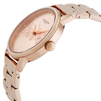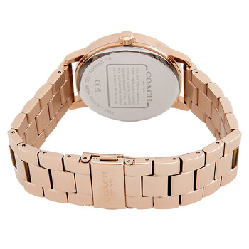 Pale rose gold ion-plated stainless steel case with a pale rose gold ion-plated stainless steel link bracelet. Fixed pale rose gold ion-plated stainless steel bezel. Carnation gold dial with rose gold-tone hands and dots hour markers. Dial Type: Analog. Quartz movement. Scratch resistant mineral crystal. Pull / push crown. Solid case back. Round case shape, case size: 36 mm. Fold over clasp with a safety release. Water resistant at 30 meters / 100 feet. Functions: hour, minute, second. Grand Series. Dress watch style. Coach Grand Quartz Carnation Gold Dial Ladies Watch 14503740.