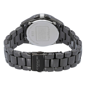 Black ceramic case and bracelet. Fixed black ceramic bezel. Black dial with silver-tone hands and index-Arabic numeral hour markers. Arabic numeral marker appears at the 6 and 12 o'clock positions. Minute markers around the outer rim. Dial Type: Analog. Date display at the 3 o'clock position. Quartz movement. Scratch resistant mineral crystal. Pull / push crown. Solid case back. Round case shape, case size: 36 mm. Deployment with push button release clasp. Water resistant at 30 meters / 100 feet. Functions: date, hour, minute, second. Greyson Series. Casual watch style. Coach Greyson Quartz Black Dial Ladies Watch 14503927.