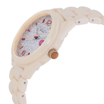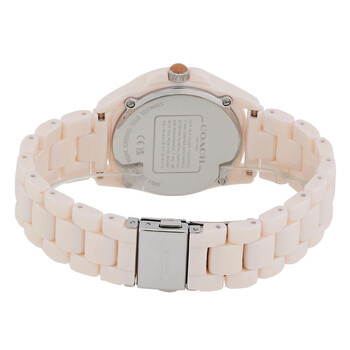 Cream stainless steel case with a pink ceramic bracelet. Fixed pink ceramic bezel. Grey dial with silver-tone hands and index hour markers. Dial Type: Analog. Date display at the 3 o'clock position. Quartz movement. Scratch resistant mineral crystal. Round case shape, case size: 36 mm. Band width: 16 mm, band length: 7.5 inches. Fold over clasp with a safety release. Water resistant at 30 meters / 100 feet. Functions: date, hour, minute, second. Greyson Series. Fashion watch style. Coach Greyson Quartz Grey Dial Ladies Watch 14503939.