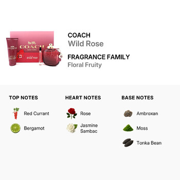 Coach Wild Rose opens with the refreshing top notes of red currant and bergamot, creating an invigorating first impression. The heart of the fragrance blooms with the exquisite scents of rose and jasmine sambac, adding a layer of sophistication and charm. The base notes of ambroxan, moss, and tonka bean provide a warm and lasting finish, ensuring that the fragrance lingers beautifully on your skin.