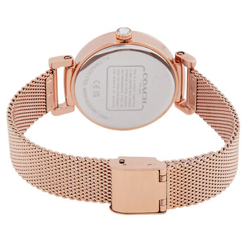 Rose gold-tone stainless steel case with a rose gold-tone stainless steel mesh bracelet. Fixed rose gold-tone bezel with crystal set. White dial with black hands and Arabic numeral hour markers. Minute markers around the outer rim. Dial Type: Analog. Quartz movement. Scratch resistant mineral crystal. Pull / push crown. Solid case back. Round case shape, case size: 32 mm. Fold over clasp. Water resistant at 30 meters / 100 feet. Functions: hour, minute, second. Madison Series. Dress watch style. Coach Madison Quartz Crystal White Dial Ladies Watch 14503398.