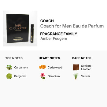 Coach for Men opens with an energizing burst of cardamom and bergamot, creating a fresh and vibrant first impression. As the scent settles, heart notes of cedarwood and geranium bring a touch of earthy elegance and floral depth. Finally, a rich base of saffiano leather and vetiver adds a smooth, masculine finish that lingers with subtle intensity.