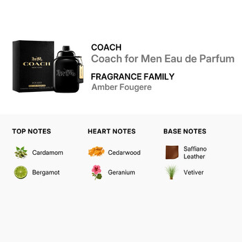Coach for Men Eau de Parfum belongs to the Amber Fougere family, offering a rich and magnetic scent journey. It opens with vibrant top notes of spicy cardamom and crisp bergamot, creating an energizing first impression. At the heart, cedarwood and geranium add a warm yet clean masculinity, while the base reveals a smooth finish of Saffiano leather and earthy vetiver—giving the fragrance a rugged, signature touch.