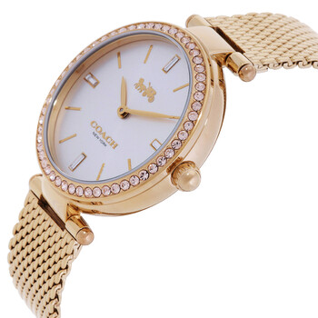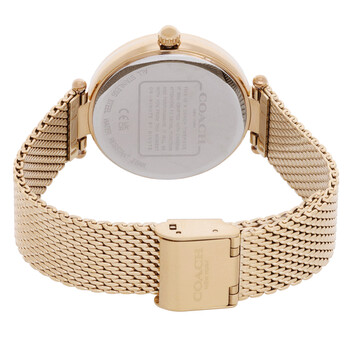 Gold-tone stainless steel case with a gold-tone stainless steel mesh bracelet. Fixed gold-tone bezel with crystal set. Silver dial with gold-tone hands and index-crystal hour markers. Crystal marker appears at the 3, 6, 9 and 12 o'clock positions. Dial Type: Analog. Quartz movement. Scratch resistant mineral crystal. Pull / push crown. Solid case back. Round case shape, case size: 34 mm. Fold over clasp. Water resistant at 30 meters / 100 feet. Functions: hour, minute. Park Series. Dress watch style. Coach Park Quartz Crystal Silver Dial Ladies Watch 14504098.