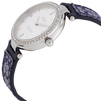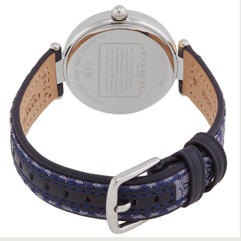 Silver-tone stainless steel case with a navy calfskin and fabric strap. Fixed silver-tone bezel with crystal set. Silver dial with silver-tone hands and index-crystal hour markers. Crystal marker appears at the 3, 6, 9 and 12 o'clock positions. Dial Type: Analog. Quartz movement. Scratch resistant mineral crystal. Pull / push crown. Solid case back. Round case shape, case size: 34 mm. Buckle clasp. Water resistant at 30 meters / 100 feet. Functions: hour, minute. Park Series. Dress watch style. Coach Park Quartz Crystal Silver Dial Ladies Watch 14504094.