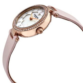 Rose gold-tone stainless steel case with a pink leather strap. Fixed rose gold-tone bezel set with crystals. Mother of pearl dial with rose gold-tone hands and crystal-set index hour markers. Dial Type: Analog. Quartz movement. Scratch resistant mineral crystal. Pull / push crown. Solid case back. Round case shape. Case size: 28 mm. Case thickness: 7 mm. Band width: 12 mm. Tang clasp. Water resistant at 30 meters / 100 feet. Functions: hour, minute. Perry Series. Casual watch style. Coach Perry Mother of Pearl Crystal Dial Ladies Watch 14503190.