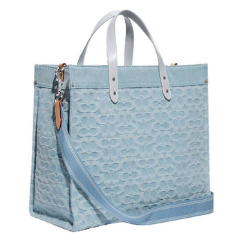Coach Men's Tote. SKU: CG023 PBU. Color: Blue. Coach Signature Denim Tote Bag. The tote bag features signature denim, an inside zip pocket, a snap closure, and fits a 15" laptop. It also includes an internal zip pocket and a single detachable strap. Material: Signature denim and refined calf leather, Fabric lining.