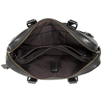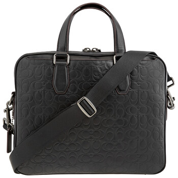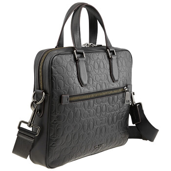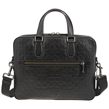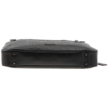 Coach Men's Briefcase. Kennedy series. SKU: 55570 QB/BK. Barcode: 192643583771. Color: Black. Size: 14 1/4" (L) x 11" (H) x 2" (W). Coach Signature Leather Kennedy Briefcase. Coach Signature leather briefcase features a zip closure, fabric lining, detachable strap with 53 1/4" drop for shoulder or crossbody wear, top handles with 4 1/4" drop, exterior zip and snap pockets, interior sleeve with secure tab for a 13" laptop, and interior zip, cell phone and multifunction pockets.