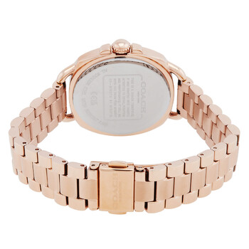 Rose gold-tone stainless steel case and bracelet. Fixed rose gold-tone stainless steel bezel. Rose gold-tone dial with rose gold-tone hands. No markers. Dial Type: Analog. Quartz movement. Scratch resistant mineral crystal. Pull / push crown. Solid case back. Round case shape, case size: 34 mm. Fold over clasp with a safety release. Water resistant at 30 meters / 100 feet. Functions: hour, minute, second. Tatum Series. Casual watch style. Coach Tatum Quartz Rose Gold Dial Ladies Watch 14504168.