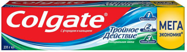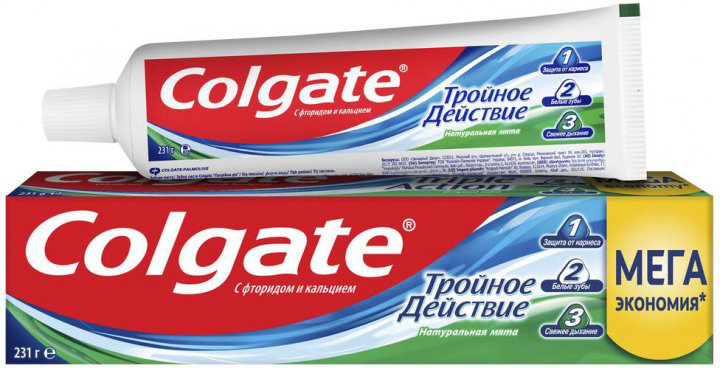 კბილის პასტა სამმაგი მოქმედება პიტნის არომატით, რომელიც ხასიათდება სამმაგი მოქმედებით იცავს კბილებს კარიესისგან, აშორებს ნადებს და ანახლებს სუნთქვას.
