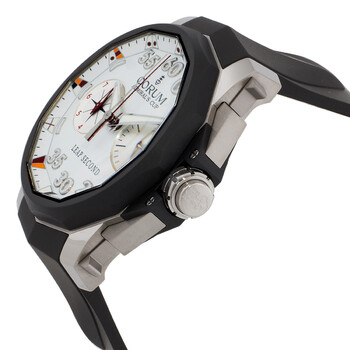 Grey titanium case with a black rubber strap. Fixed black titanium bezel. White dial with silver-tone hands and Arabic numeral hour markers. Minute markers around the outer rim. Dial Type: Analog. Luminescent hands and markers. Chronograph - two sub-dials displaying: 1/8th second and 30 minute. Corum Calibre CO 895 Automatic movement, containing 40 Jewels, bitting at 28800 vph, and has a power reserve of approximately 42 hours. Scratch resistant sapphire crystal. Pull / push crown. Solid case back. Dodecagon case shape, case size: 48 mm, case thickness: 18 mm. Band width: 24 mm, band length: 8 inches. Tang clasp. Water resistant at 100 meters / 330 feet. Functions: chronograph, hour, minute, second. Additional Info: hours, minutes, split seconds chronograph, leap seconds. Admiral Cup Series. Luxury watch style. Watch label: Swiss Made. Item Variations: A895/04302. Corum Admiral Cup Chronograph Automatic White Dial Men's Watch A895/04302.