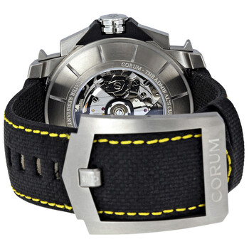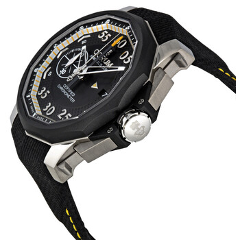Grey titanium case with a black fabric strap. Fixed black PVD titanium bezel. Black dial with skeleton hands and nautical flag hour markers. Minute markers around the outer rim. Dial Type: Analog. Luminescent hands and markers. Date display at the 3 o'clock position. One subdial displaying: small second at the 9 o'clock position. Corum Calibre CO 960 Automatic movement, based upon ETA 7750, containing 27 Jewels, bitting at 28800 vph, and has a power reserve of approximately 42 hours. Scratch resistant sapphire crystal. Protected titanium crown. Skeleton case back. Dodecagon case shape, case size: 48 mm, case thickness: 16.5 mm. Band width: 24 mm, band length: 8 inches. Tang clasp. Water resistant at 300 meters / 1000 feet. Functions: hours, minutes, seconds, date, chronograph. Admirals Cup Seafender Series. Casual watch style. Watch label: Swiss Made. Corum Admirals Cup Center Chronograph Automatic Black Dial Men's Watch 960101040231AN14.