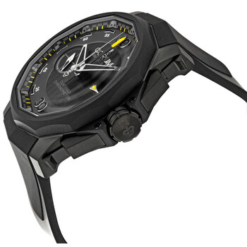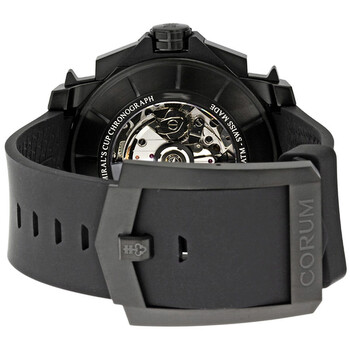 Black PVD titanium case with a black vulcanized rubber strap. Fixed black vulcanized rubber black titanium bezel. Grey with geneva striping dial with luminous hands and index hour markers. Minute markers with arabic numerals at 5 minute intervals. Dial Type: Analog. Luminescent hands and markers. Date display at the 3 o'clock position. One subdial displaying: small second at the 9 o'clock position. Corum Calibre CO 960 Automatic movement, based upon ETA 7750, containing 27 Jewels, bitting at 28800 vph, and has a power reserve of approximately 42 hours. Scratch resistant sapphire crystal. Black PVD titanium crown. Skeleton case back. Dodecagon case shape, case size: 53.3 mm, case thickness: 17.5 mm. Band width: 24 mm, band length: 9 inches. Tang clasp. Water resistant at 300 meters / 1000 feet. Functions: hours, minutes, seconds, chronograph, date. Admirals Cup Series. Sport watch style. Watch label: Swiss Made. Item Variations: 960 101 94-0371 AN12, 960-101-94-0371-AN12, 96010194-0371AN12. Corum Admirals Cup Chronograph Titanium Grey Dial Men's Watch 960101940371-AN12.
