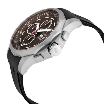 Silver-tone stainless steel case with a black rubber strap. Fixed silver-tone stainless steel bezel. Brown dial with luminous silver-tone hands and index hour markers. Minute markers around the outer rim. Dial Type: Analog. Luminescent hands and markers. Day of the week and date display at the 3 o'clock position. Chronograph - three sub-dials displaying: 60 second, 30 minute and 12 hour. Corum Calibre CO 077 Automatic movement, containing 25 Jewels, bitting at 28800 vph, and has a power reserve of approximately 42 hours. Scratch resistant sapphire crystal. Pull / push crown. Transparent case back. Dodecagon case shape, case size: 47 mm. Deployment clasp. Water resistant at 100 meters / 330 feet. Functions: chronograph, date, day, hour, minute, second. Admirals Cup Legend Series. Sport watch style. Watch label: Swiss Made. Item Variations: 077.100.04/F371 BR50. Corum Admirals Cup Legend Chronograph Automatic Brown Dial Men's Watch A077/04181.