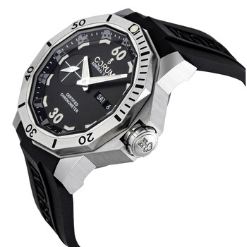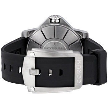 Titanium case with a black rubber strap. Fixed titanium bezel. Black dial with silver-tone hands and index hour markers. Arabic numeral minute markers at the 30 and 60 minute positions. Minute markers around the outer rim. Dial Type: Analog. Luminescent hands and markers. Day of the week and date display at the 3 o'clock position. Small second sub-dial at the 9 o'clock position. Automatic movement with a 48 hour power reserve. Scratch resistant sapphire crystal. Protected screw down crown. Solid case back. Case diameter: 46 mm. Case thickness: 14 mm. Band width: 22 mm. Tang clasp. Water resistant at 300 meters / 1000 feet. Functions: date, hour, minute, second. Casual watch style. Watch label: Swiss Made. Corum Admirals Cup Seafender 46 Chrono Automatic Watch 947.401.04/0371 AN12.