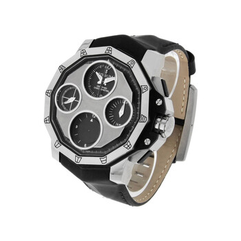 Grey titanium case with a black leather strap. Fixed grey titanium bezel. Grey dial with silver-tone hands and Arabic numeral hour markers. Minute markers around the outer rim. Dial Type: Analog. Luminescent hands. Chronograph - three sub-dials displaying: 60 second, 30 minute and 12 hours. Corum Calibre CO 987 automatic movement with a 42-hour power reserve. Scratch resistant sapphire crystal. Screw down crown. Transparent case back. Dodecagon case shape, case size: 48 mm, case thickness: 17 mm. Buckle clasp. Water resistant at 100 meters / 330 feet. Functions: chronograph, hour, minute, small second. Luxury watch style. Watch label: Swiss Made. Corum Admirals Cup Seafender Men's Watch 987.980.04/0061 AN04.
