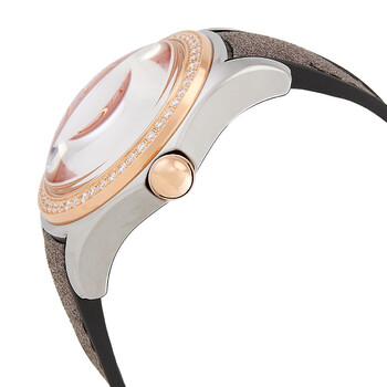 Silver-tone stainless steel case with a grey leather strap. Fixed rose gold-tone bezel with diamond set 18kt rose gold. Silver dial with gold-tone hands and index-Arabic numeral hour markers. Dial Type: Analog. Automatic movement. Scratch resistant sapphire crystal. Round case shape. Functions: hour, minute, second. Sport watch style. Watch label: Swiss Made. Corum Automatic Diamond Silver Dial Watch 295.100.29/0669 DN36.