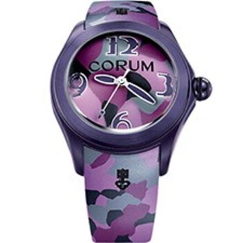 Purple PVD stainless steel case with a purple camoflage vulcanized rubber strap. Fixed purple PVD stainless steel bezel. Purple camoflage dial with silver-tone hands and Arabic numeral hour markers. Dial Type: Analog. Luminescent purple superluminova. Corum Calibre CO 082 automatic movement with a 42-hour power reserve. Scratch resistant sapphire crystal. Pull / push crown. Transparent case back. Round case shape, case size: 42 mm, case thickness: 16.50 mm. Buckle clasp. Water resistant at 100 meters / 330 feet. Functions: hour, minute, second. Sport watch style. Watch label: Swiss Made. Corum Bubble 42 Automatic Purple Camoflage dial Unisex Watch 082.413.98/0390 CA03.