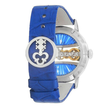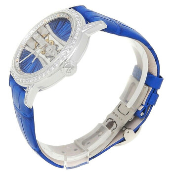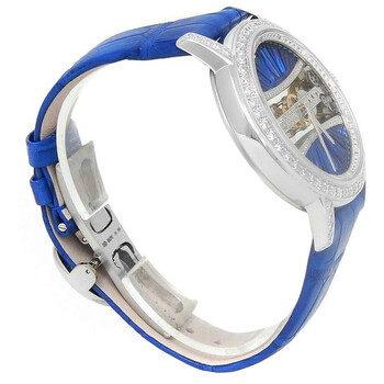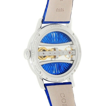 18kt white gold case with a blue genuine leather strap. Fixed bezel with diamond set 18kt white gold. Blue dial with silver-tone hands and diamond hour markers. Dial Type: Analog. Corum Calibre CO 113 Hand Wind movement, containing 19 Jewels, bitting at 28800 vph, and has a power reserve of approximately 40 hours. Scratch resistant sapphire crystal. Transparent see through case back. Round case shape, case size: 39 mm. Deployment with push button release clasp. Water resistant at 30 meters / 100 feet. Functions: hour, minute. Golden Bridge Series. Dress watch style. Watch label: Swiss Made. Corum Golden Bridge Hand Wind Diamond Blue Dial Unisex Watch 113.000.69/0F03 BD91G.